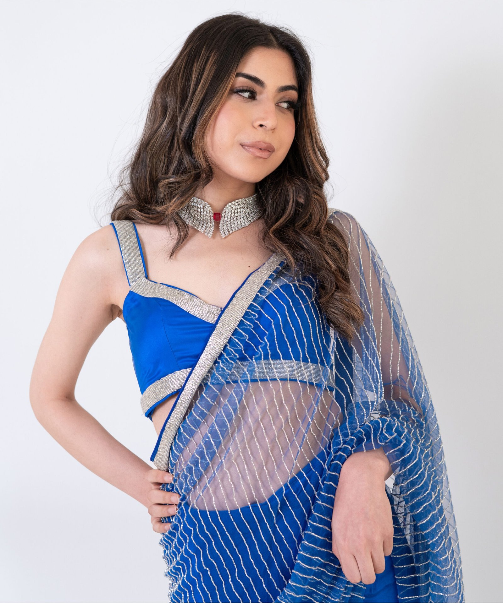 Bold, refined, and undeniably striking — this electric blue pre-draped saree is crafted in fluid fabric and hand-embroidered with intricate silver cut dana work that plays beautifully with light. The silhouette is pre-stitched for ease, offering the elegance of a saree with the effortlessness of modern wear.
