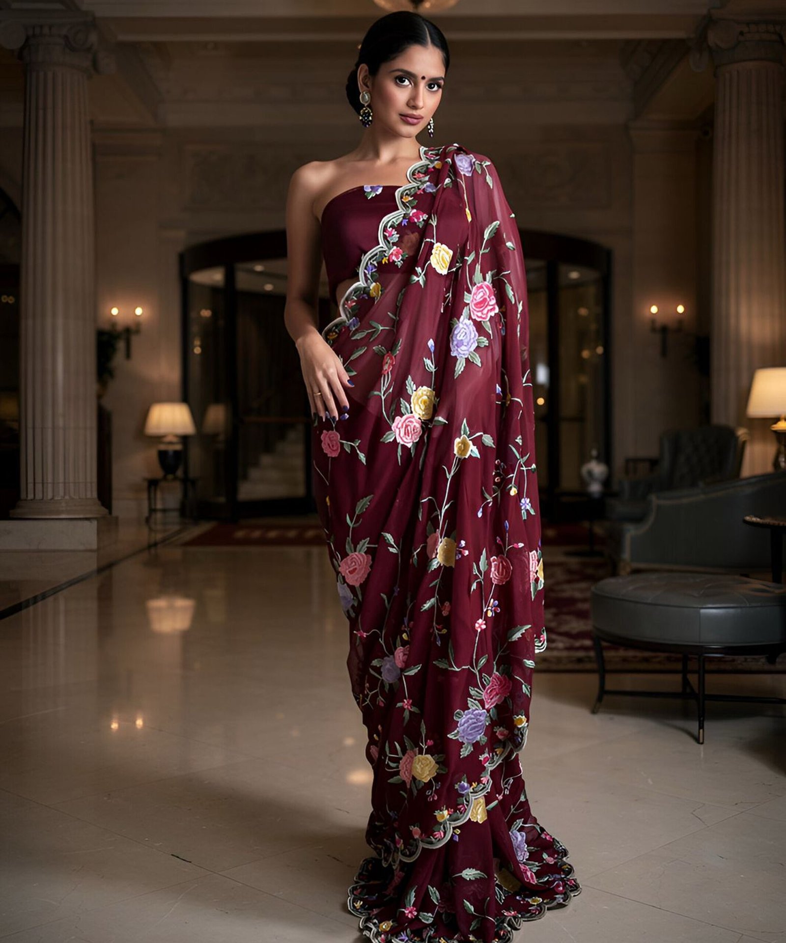 A tribute to timeless flora, this deep wine-hued saree from our Maison des Fleurs collection is adorned in classic Parsi Gara hand embroidery, celebrating heritage artistry through modern couture expression. Each motif is meticulously crafted using fine silk threads, forming a botanical symphony of roses, lilies, and blooming vines across pure georgette.