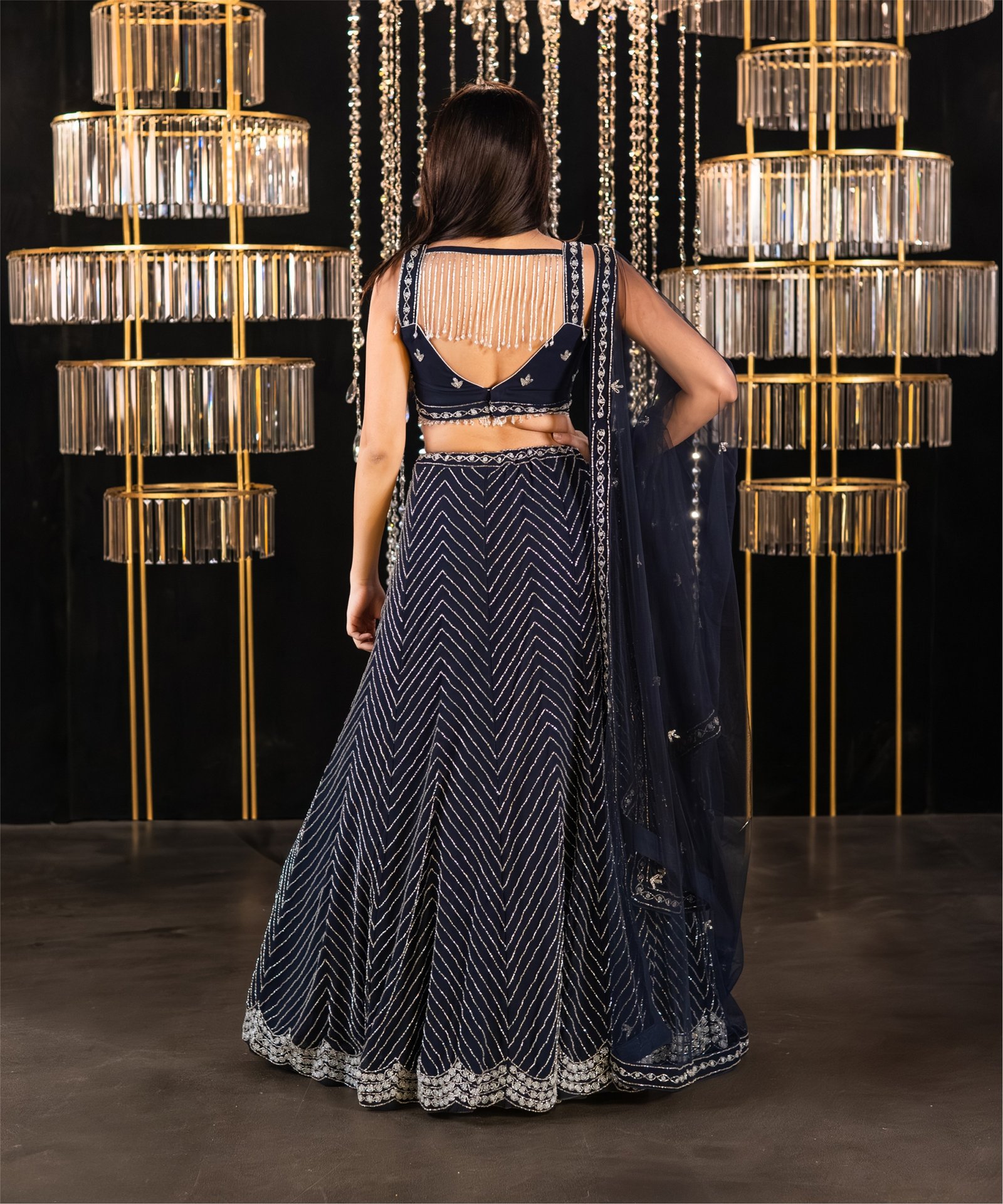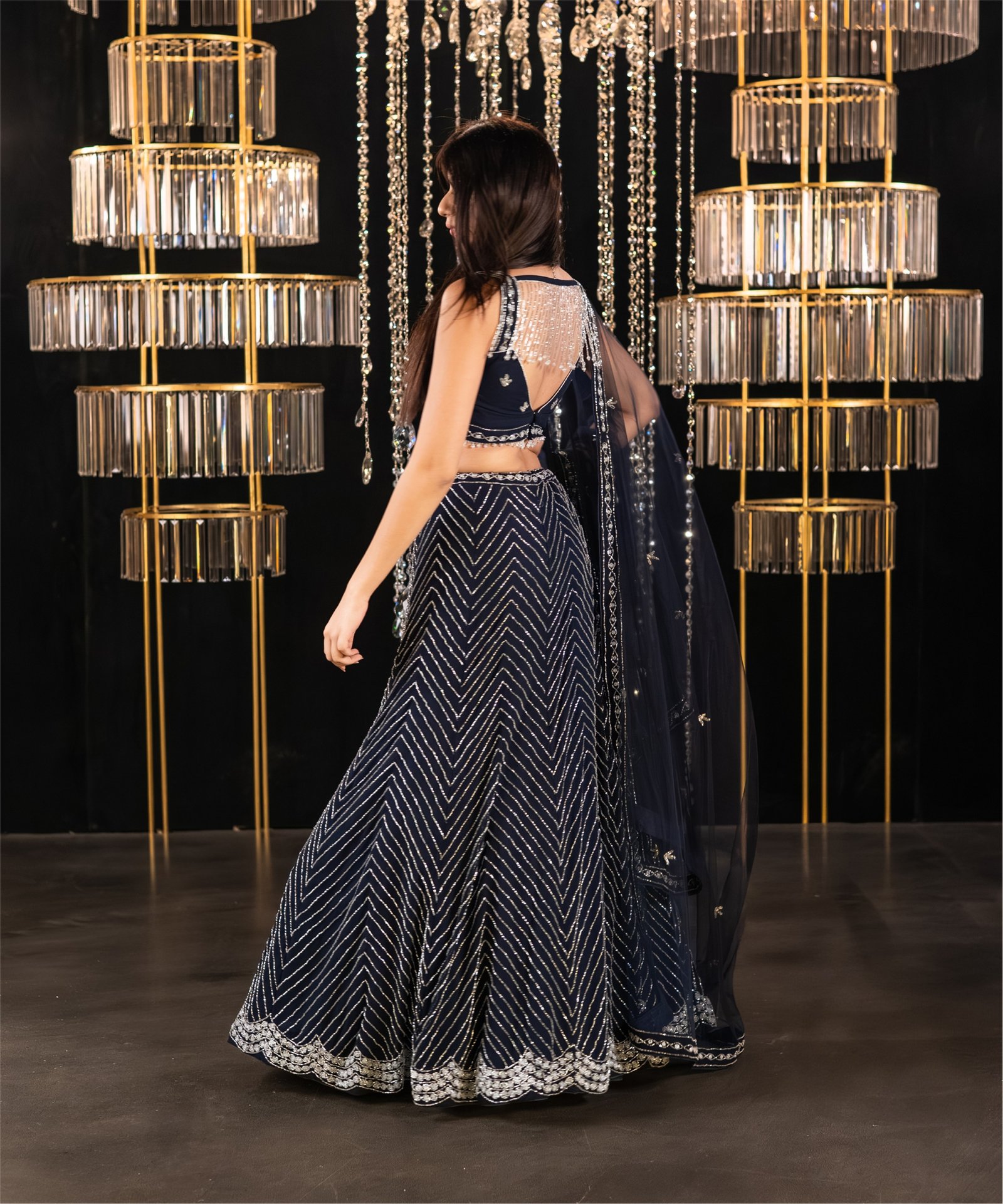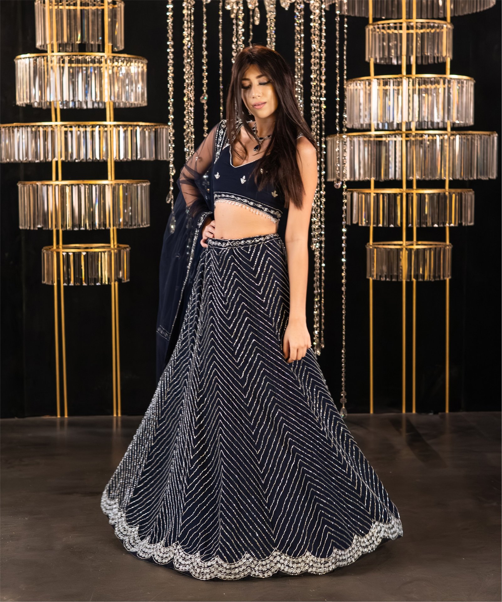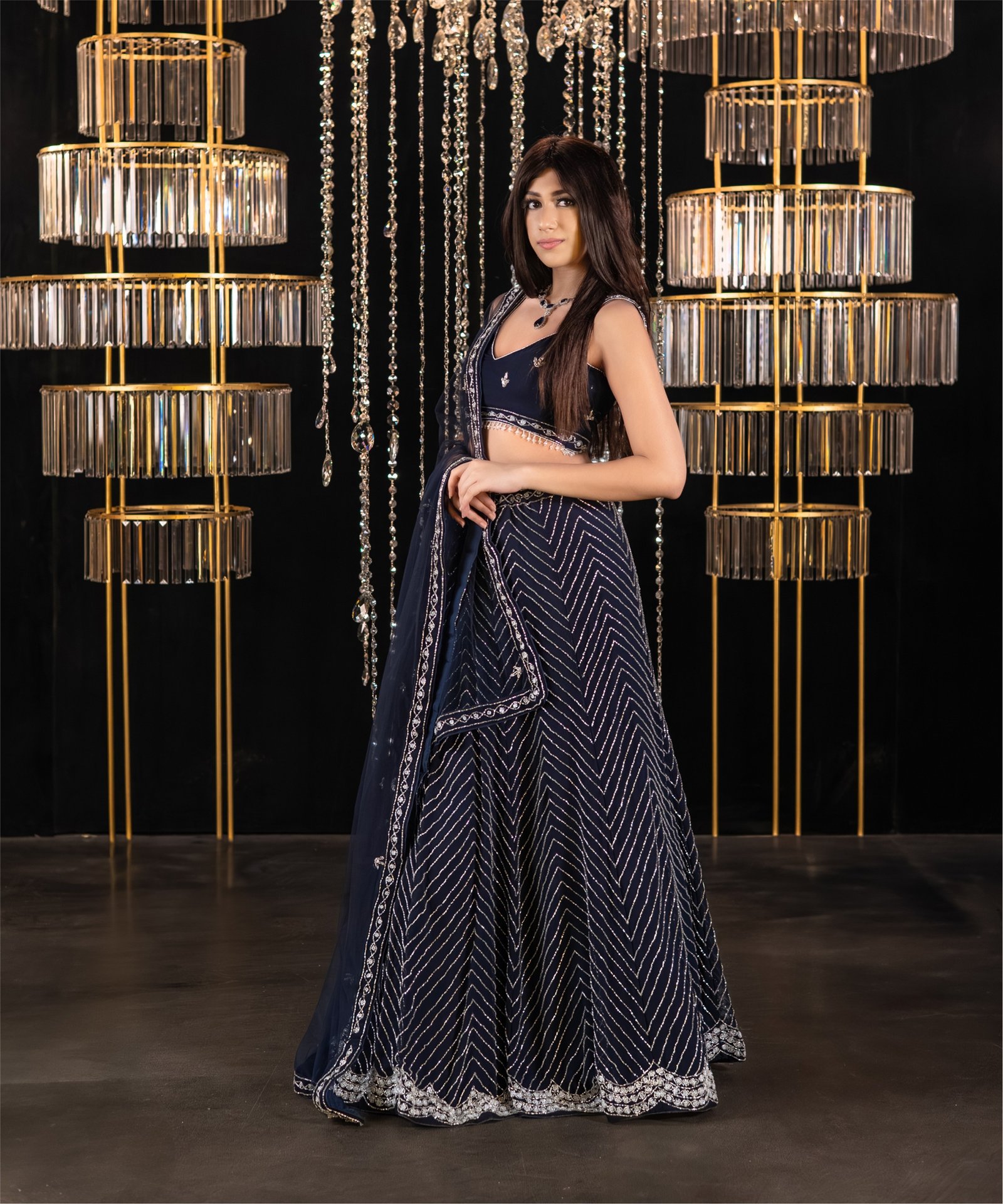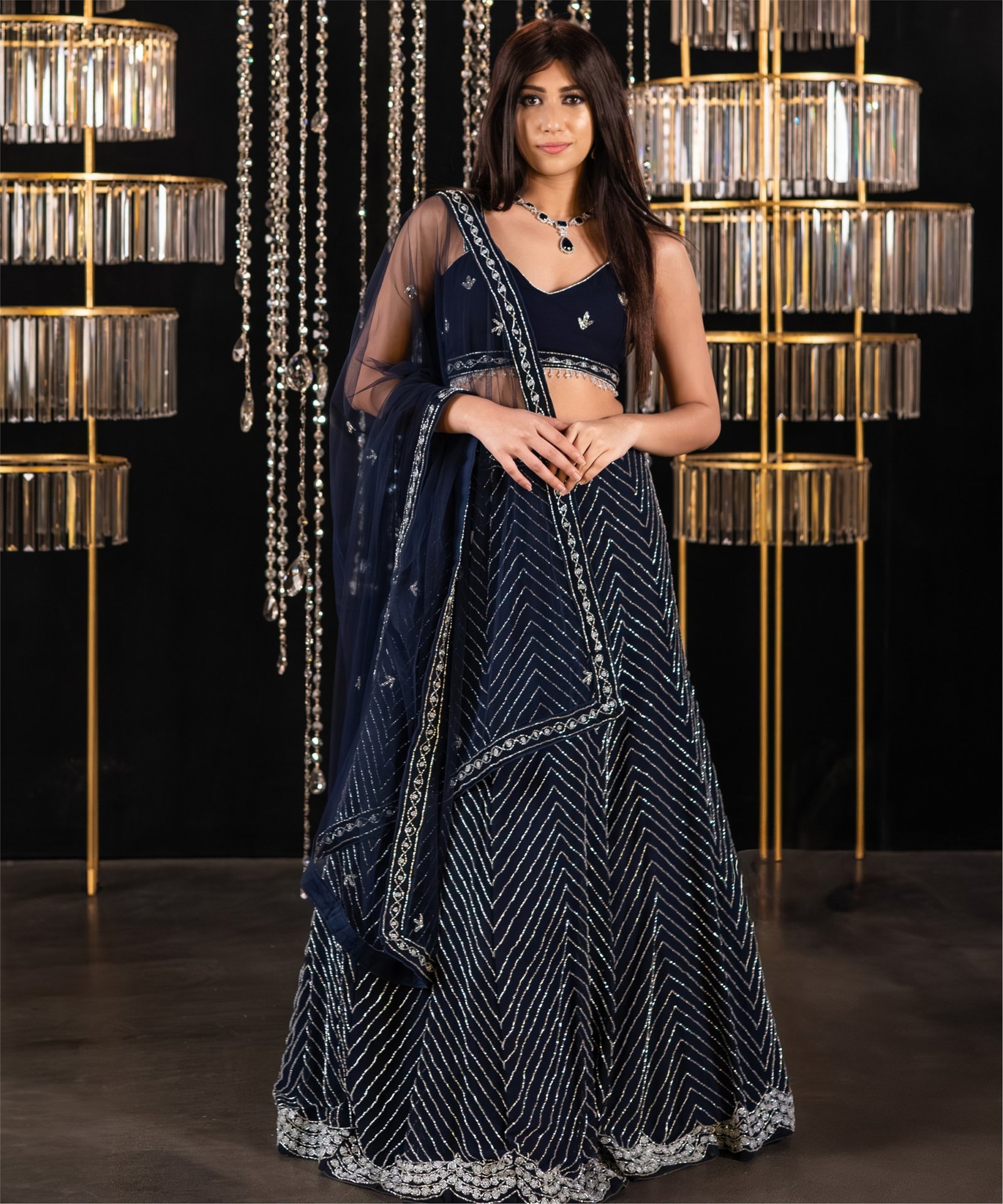 A timeless ensemble crafted in georgette, this lehenga features intricate silver cut-bead and mirror hand embroidery that glistens with every movement. Paired with a lightweight net dupatta, delicately accented to balance elegance and ease, this piece is perfect for receptions, cocktail nights, Diwali parties and evening celebrations.