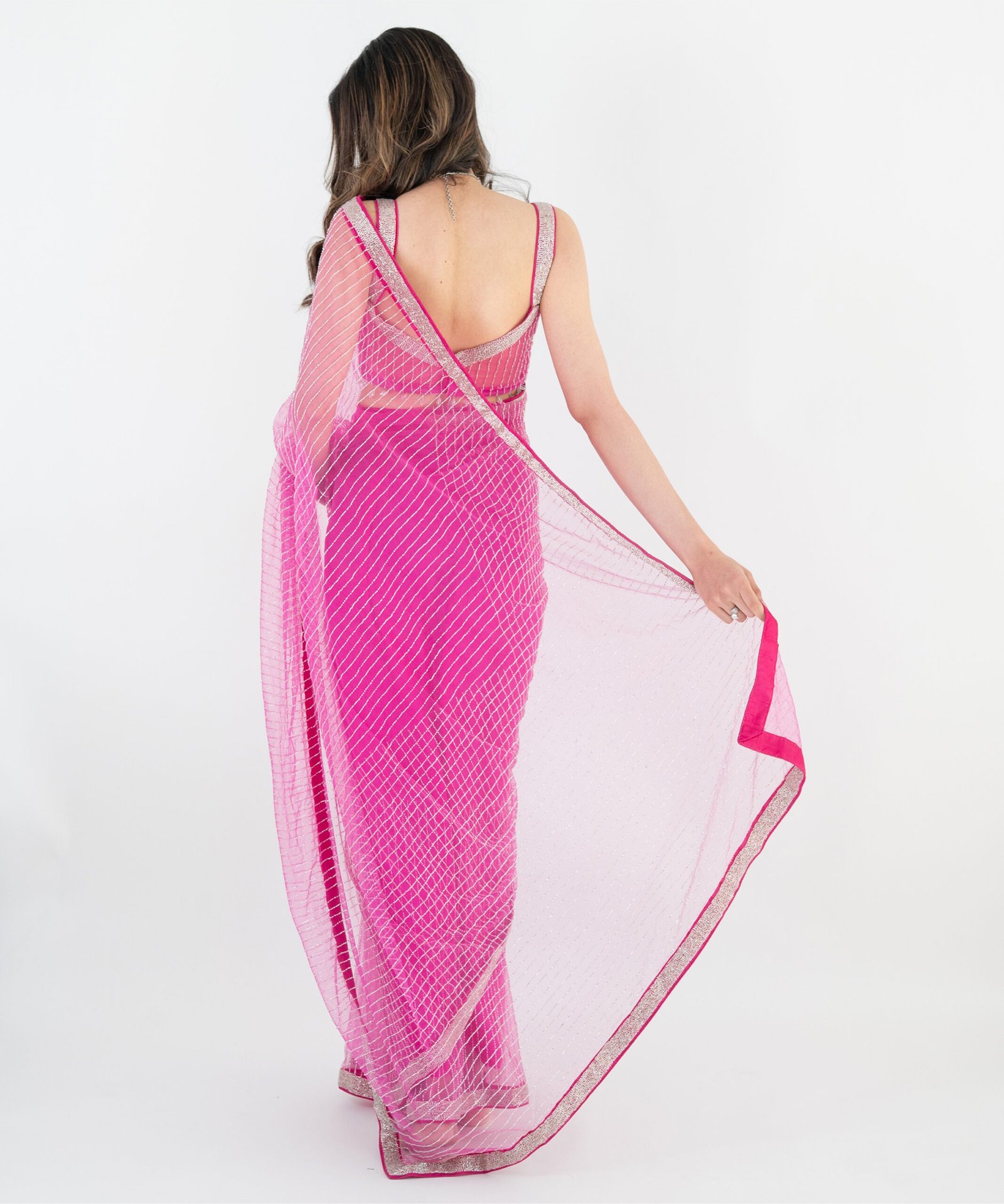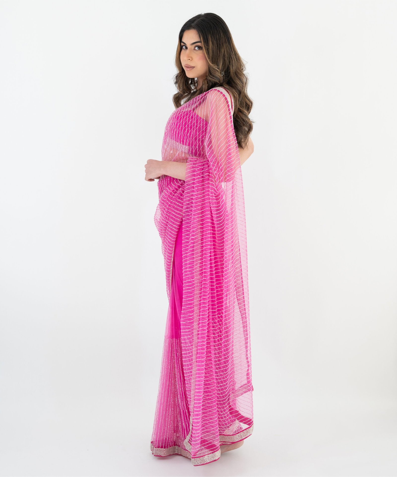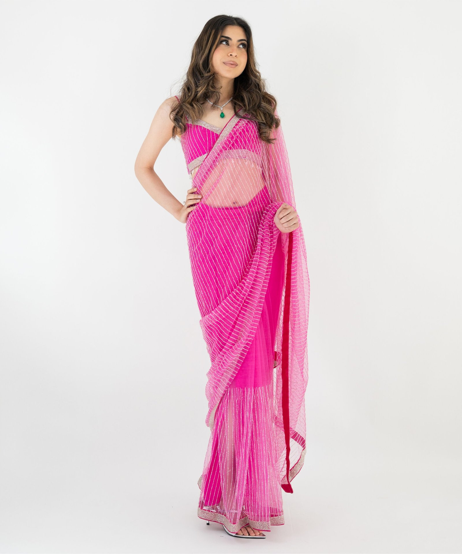 Where classic charm meets modern ease — this pink pre-draped saree is crafted in sheer net and hand-embroidered with fine silver cut dana work that adds just the right amount of shimmer. Paired with a matching embroidered blouse, the look is balanced, refined, and striking without trying too hard.