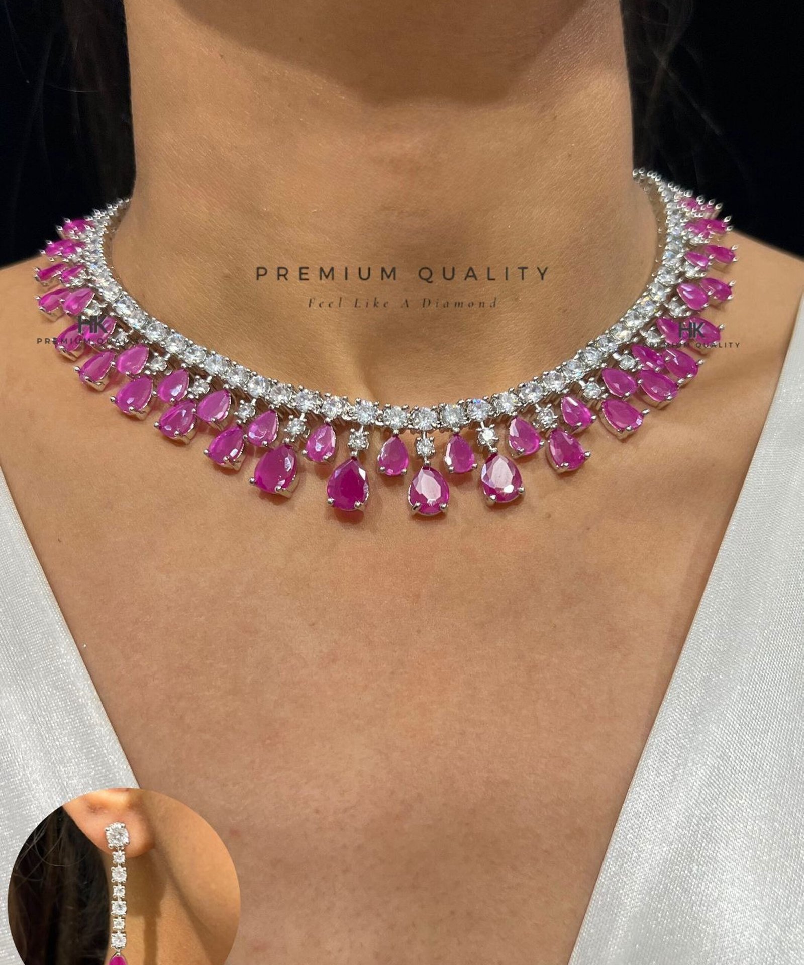 Crafted with exceptional precision, high-grade stones, and superior finishing, this set delivers the brilliance, clarity and feel of real diamonds, making it the perfect choice for weddings, sangeet nights, cocktail evenings and luxury soirées.